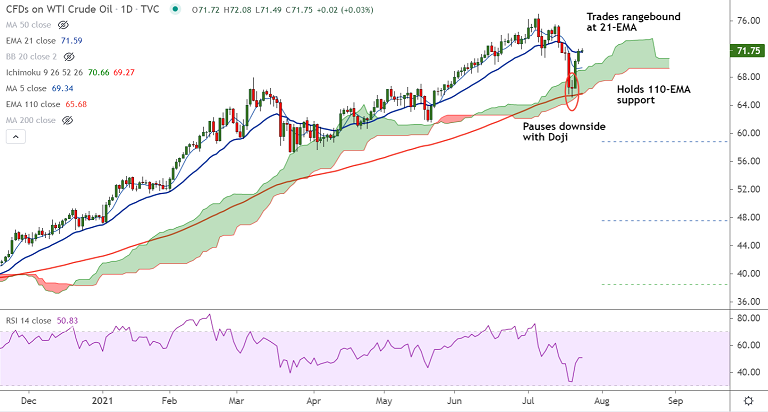 The pair hovers around 21-EMA resistance at 71.59, and decisive break above will fuel further gains.