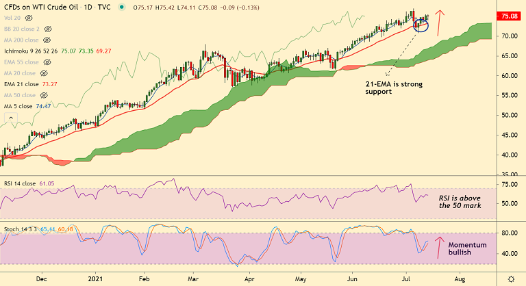 West Texas Intermediate prices are extending upside after bounce off 21-EMA support.