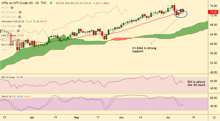 WTI was trading 1.21% lower on the day at $73.76 at around 12:50 GMT, after closing 1.95% higher in the previous session.