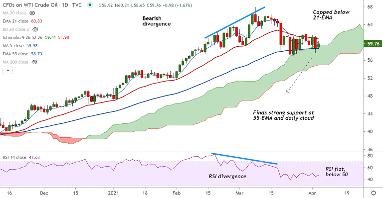 West Texas Intermediate (WTI) crude oil was holding marginal gains on the day, was trading at 59.71 at around 12:30 GMT.
