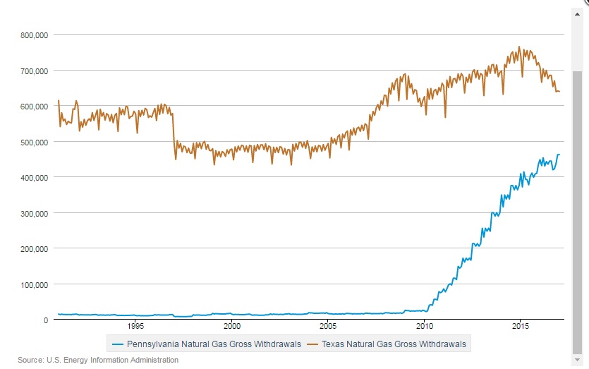 Back in January 2010, Pennsylvania was producing about 22,711 million cubic feet of natural gas, which was just about 1 percent of the total production of the United States. At the time, one of the top producing states Texas was producing about 28 percent of the US natural gas production. But since then, the production in Pennsylvania has gone up by many folds. While the production in Texas declined by more than 15 percent since the summer of 2015, the production has continued to grow in Pennsylvania.