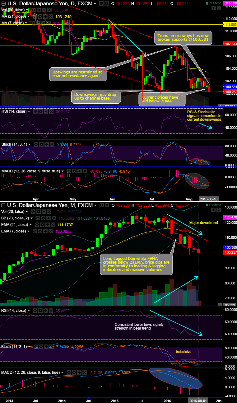 Despite tight range between 102.436 on the north to 100.748 on the south, the pair manages to break supports at 100.531.