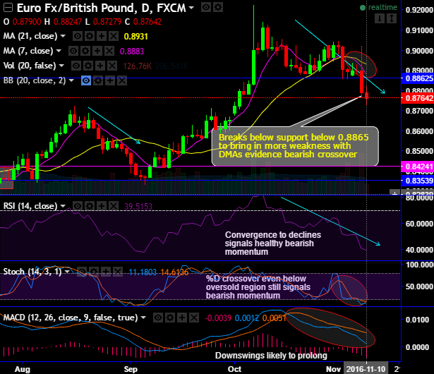 EURGBP sharply reversed the initial reaction to Trump’s victory, collapsing through recent range supports in the 0.8865- 0.8850 region.