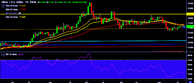 We prefer to take long position on XAG/USD only above $17.18, stop loss at $16.98 and target of $17.40.