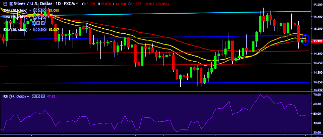 We prefer to take short position on XAG/USD only below $14.94, stop loss at $15.08 and target of $14.62.