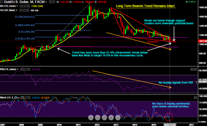 Gold prices have been relentlessly tumbling from 1795.80 in October 2012 to the recent lows of 1064.34 levels.