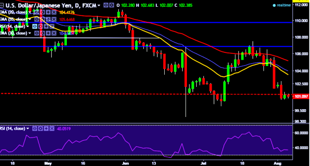 - USD/JPY is currently trading around 101.05 marks.