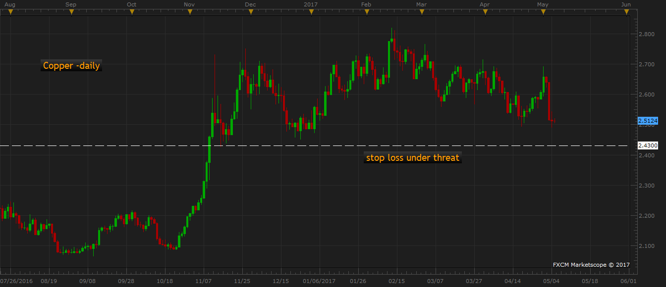 However, in the following months, it became clear that the President’ Trump’s promised infrastructure spending approval could take a much longer time than originally anticipated. In addition to that, rising cost of borrowing in China is leading to major selloffs in the commodity segment. Our call has not yet hit our recommended large stop loss around $2.43 per pound; we suspect that the level might get breached over the coming months. As of now, copper is testing support around $2.5 psychological area, however, if it fails to find support and move above $2.7 per pound, a bearish scenario would be increasingly likely that could push down the price to as low as $2.06 per pound.