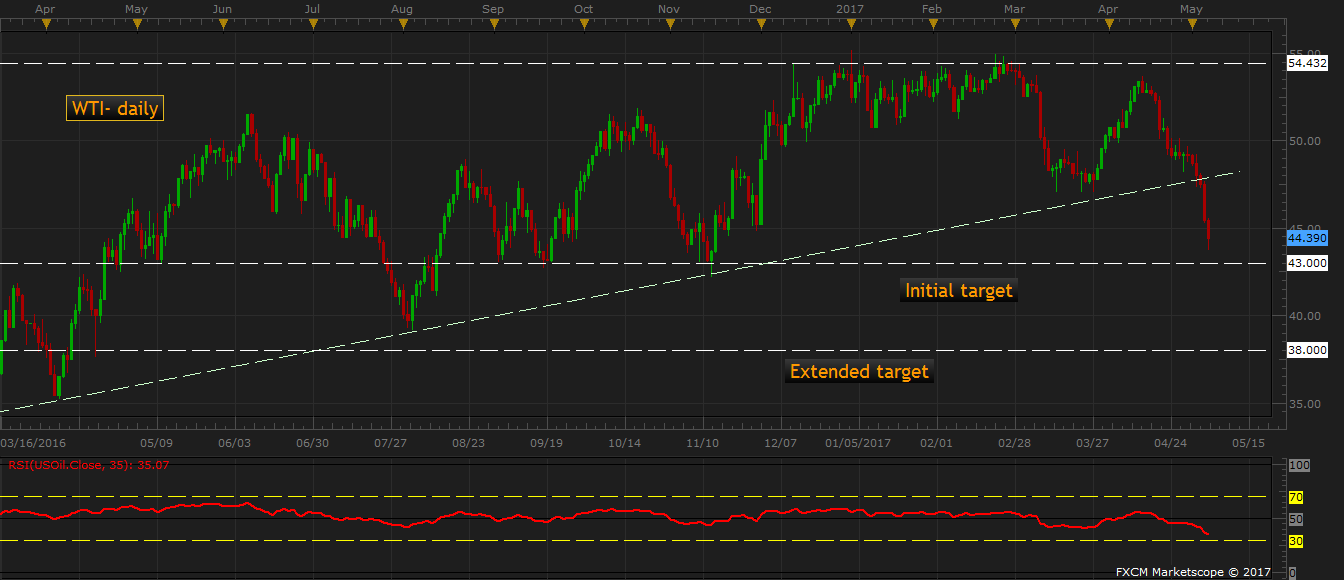 The rising production in the United States and the failure of the OPEC deal to reduce inventories prompted hedge funds and money managers to cut their long position in WTI and pushed the oil price to the lowest point since the OPEC deal. WTI is currently trading at $44.2 per barrel. As the oil price has moved close to our forecasted target, we would like to extend the target towards $38 per barrel in the short term. We would also like to revise our stop loss from $55 per barrel to $49 per barrel.