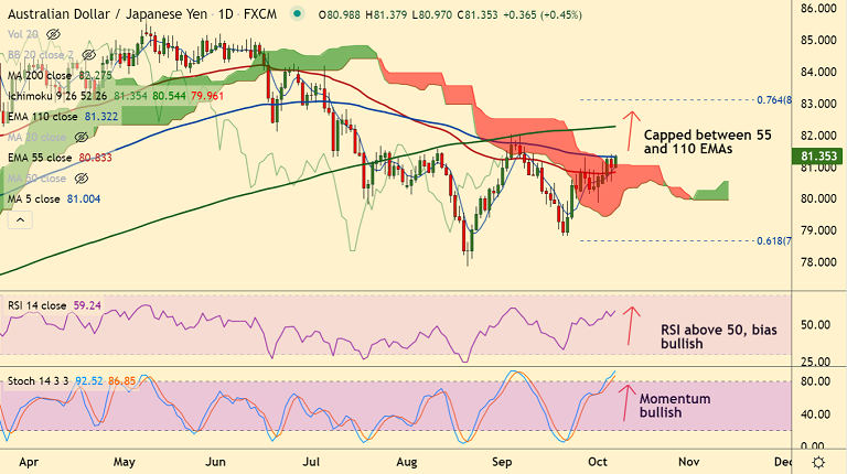 AUD/JPY was trading 0.39% higher on the day at 81.30 at around 11:30 GMT, bias tilted towards the upside
