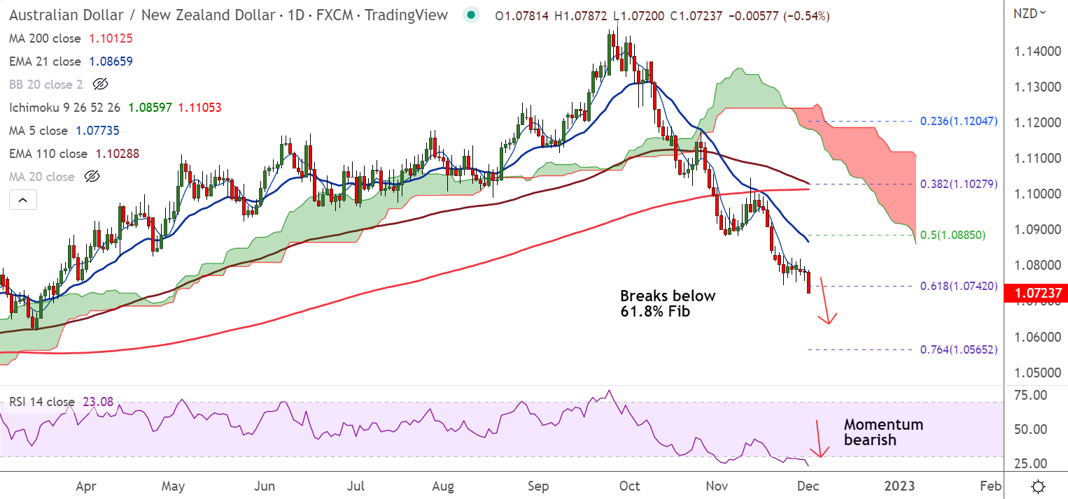 - The pair has broken below 61.8% Fib support raising scope for further downside