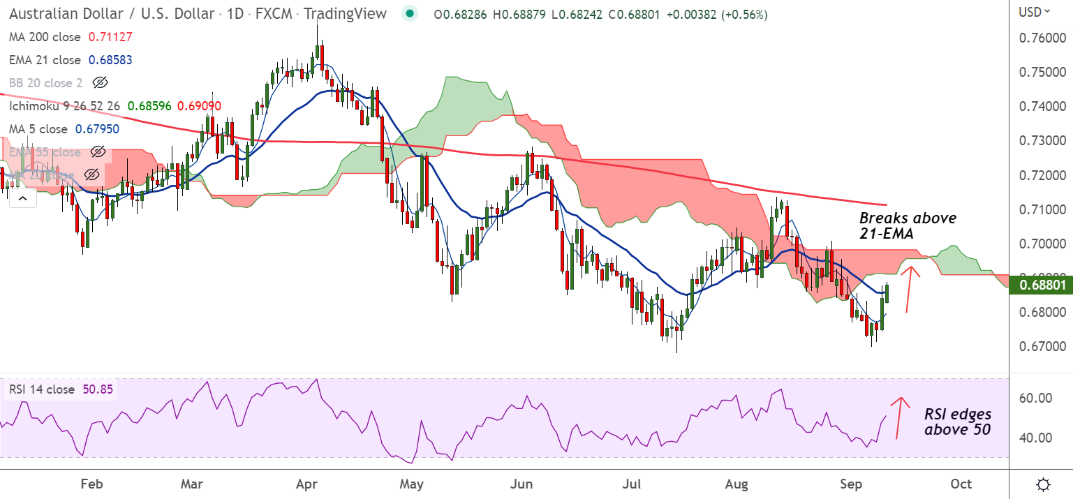 Summary: AUD/USD poised for further upside. Close above 21-EMA will fuel further gains. Bulls eye 55-EMA at 0.6914.