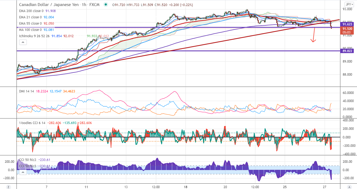 CADJPY has once again declined after a minor pullback till 92.51. The pair should break above 93.02 for further bullishness. The minor weakness in the Canadian dollar against the US dollar is putting pressure on this pair at higher levels. Markets eye BOC monetary policy for further direction. The bullish trend in oil price is supporting the Canadian dollar. The intraday trend of CADJPY is bearish as long as resistance 92.50 holds.
