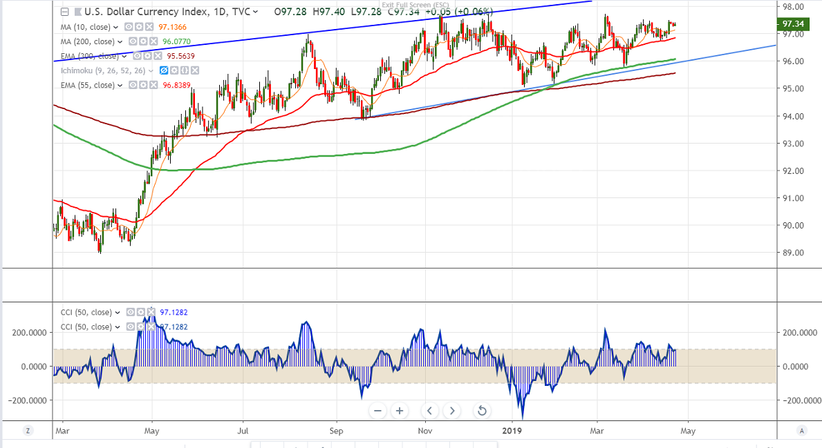 US dollar index is consolidating after hitting high of 97.49. Previously index made high of 97.52 on Apr 2nd 2019 and shown a decline till 96.75 level.DXY has taken support near 55 day EMA and is currently trading around 97.34.
