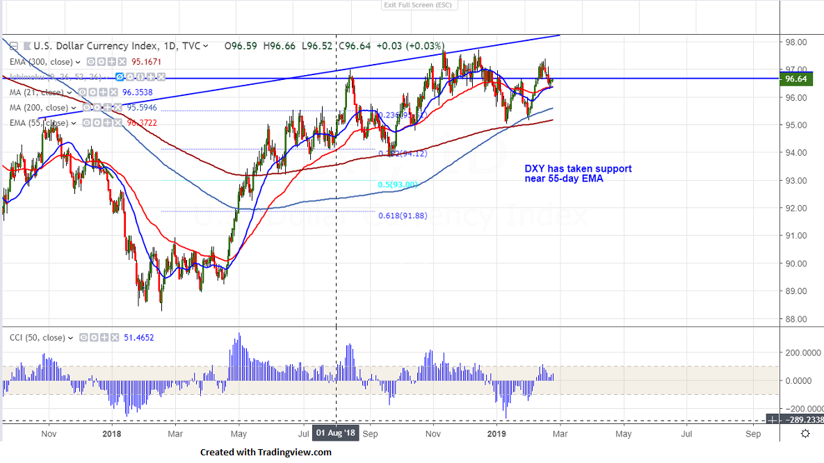 DXY is trading flat after hitting low of 96.29 on Feb 20th 2019. The index jumped till 96.66 and is hovering around that level. The index has taken support after showing a minor decline below 50- day MA. It is currently trading around 96.64.