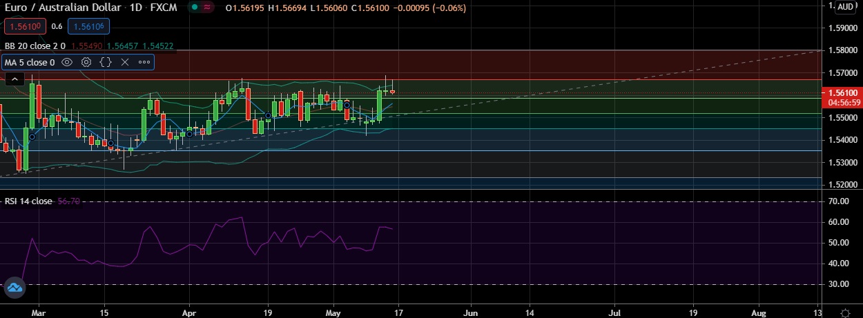 • At GMT 16:00, the pair was trading 0.06% lower at 1.5611. The cross pairs bearish bias is set to strengthen, likely to drop towards 1.5550