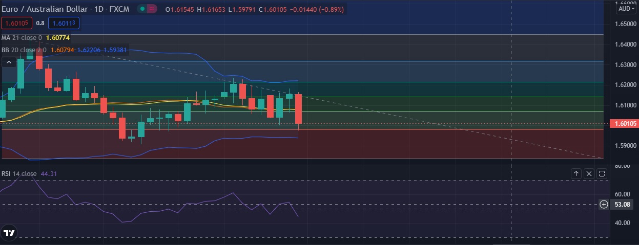 • Strong support is seen at 1.5978 (23.6 %fib ) and break below could take the pair towards 1.5942 (Lower BB).