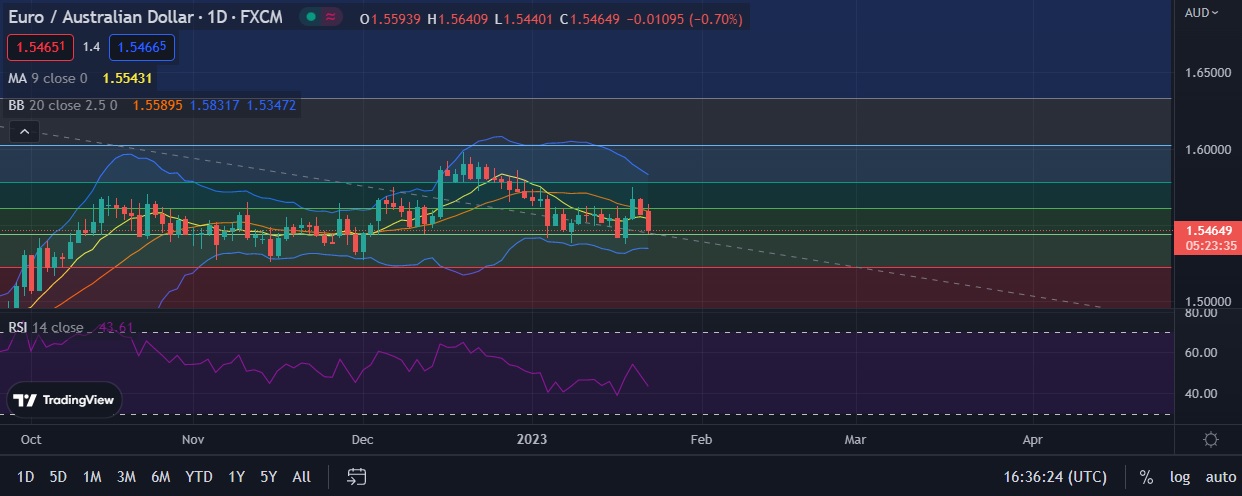 • Support is seen at 1.5439 (38.2% fib) and break below could take the pair towards 1.5345 (Lower BB).