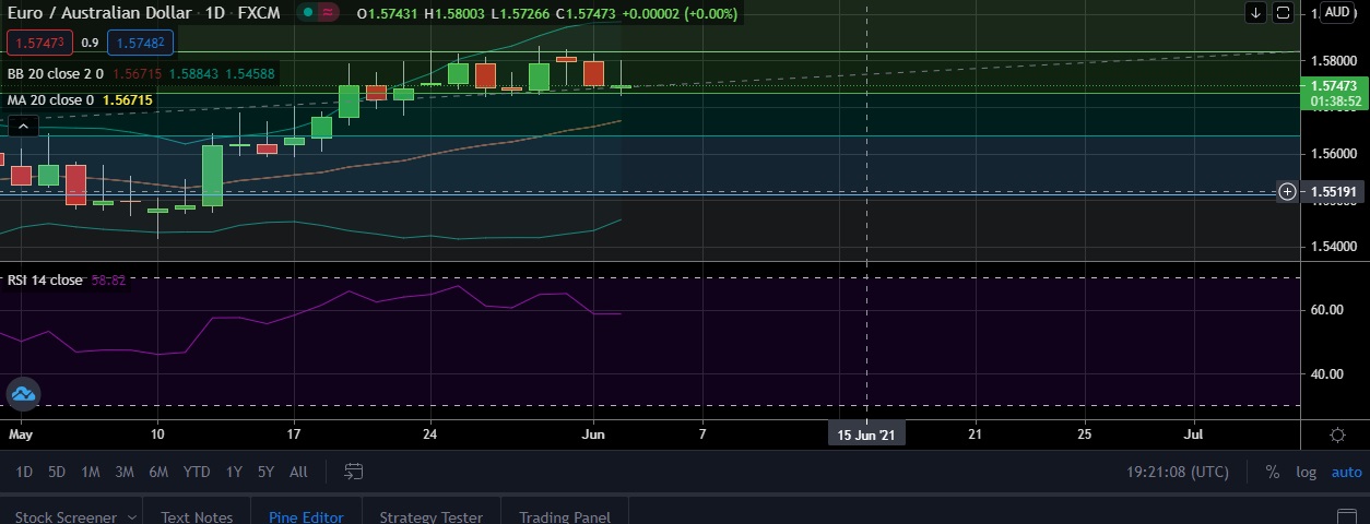 • EUR/AUD hits daily high at 1.5803 but reverses course to trade at 1.5746 in afternoon US session.