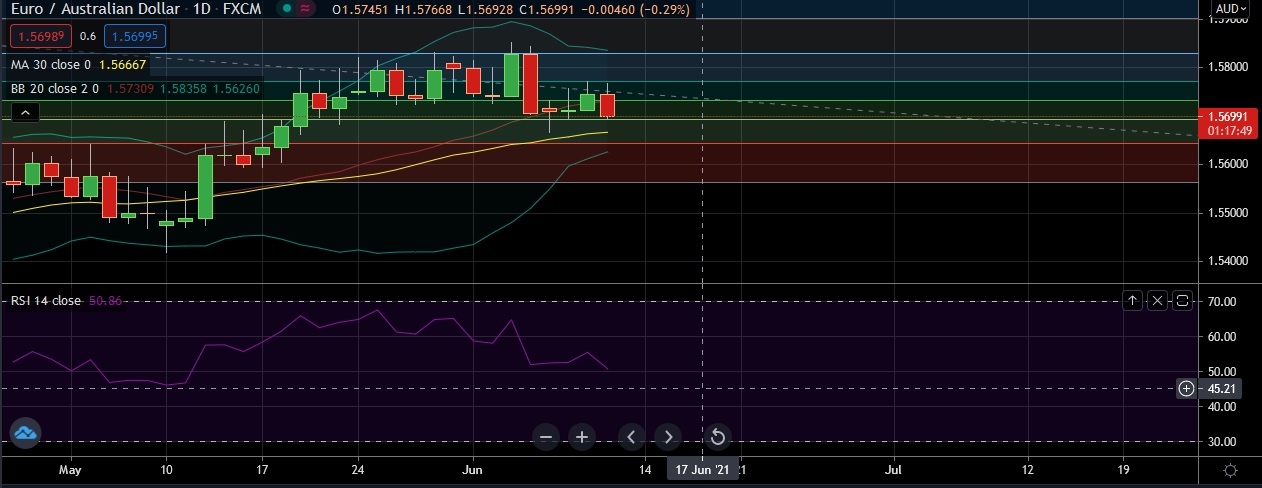 • Strong support is seen at 1.5693 (38.2%fib) and break below could take the pair towards 1.5666(30 DMA).