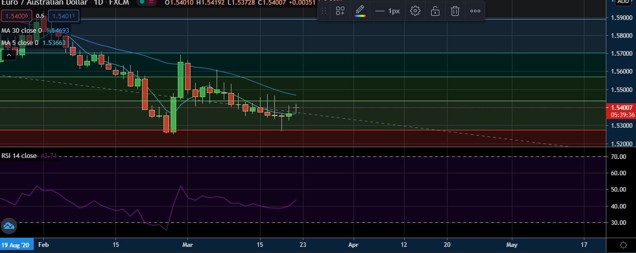 • EUR/AUD gained some ground on Monday but lack of liquidity in market and spread of the COVID-19 and government lockdowns in Eurozone kept gains in check.