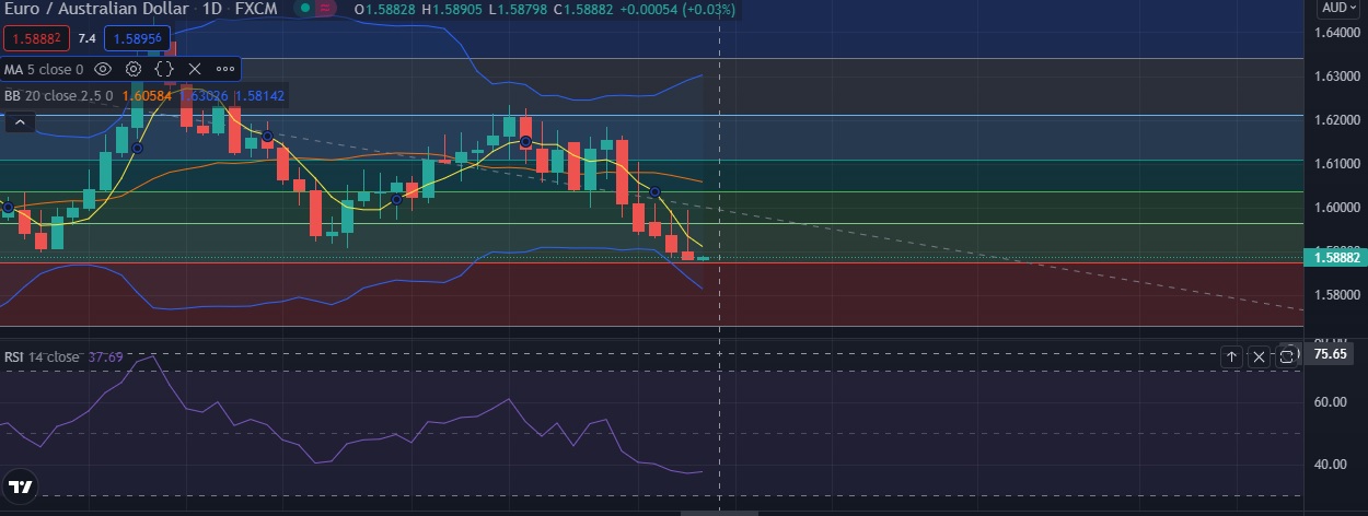 • EUR/AUD is approaching 1.5877(23.6 %fib ) support, a break of which could trigger a drop to lower bollinger band.