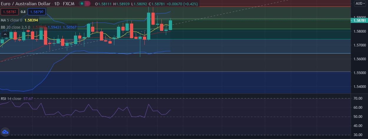 • EUR/AUD bulls confidence is running high, a test of the 1.5944 (Higher BB) highly seem s likely.