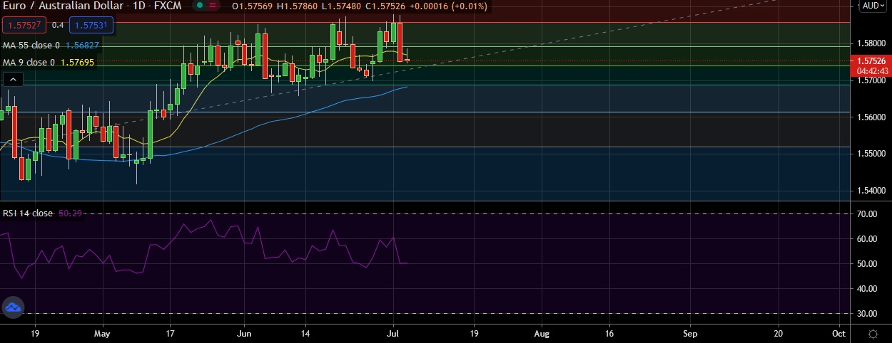 • Strong support is seen at 1.5741 (50%fib ) and break below could take the pair towards 1.5687 (61.8%fib).