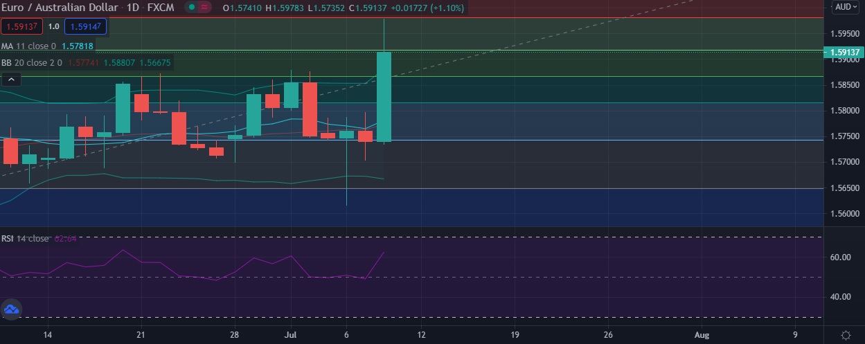 • EUR/ AUD rose sharply on Thursday as euro was boosted across the board after the European Central Bank set a new inflation target and claimed a role in fighting climate change.