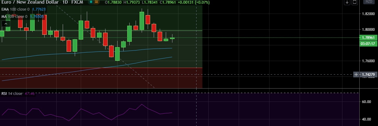 • Immediate support is seen at 1.7763 (100 EMA ) and break below could take the pair towards 1.7652 (100 DMA).