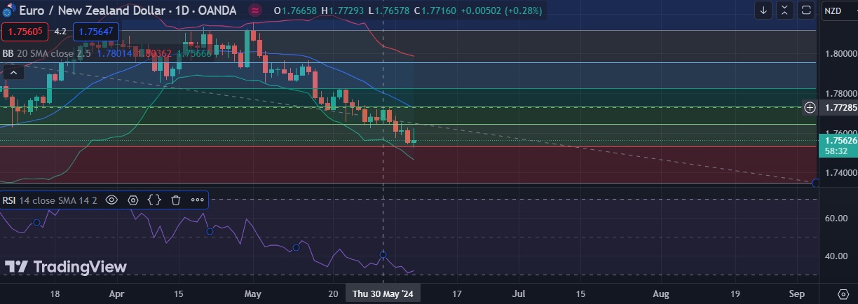 • Support is seen at 1.7530(23.6%fib) and break below could take the pair towards 1.7472(Lower BB).