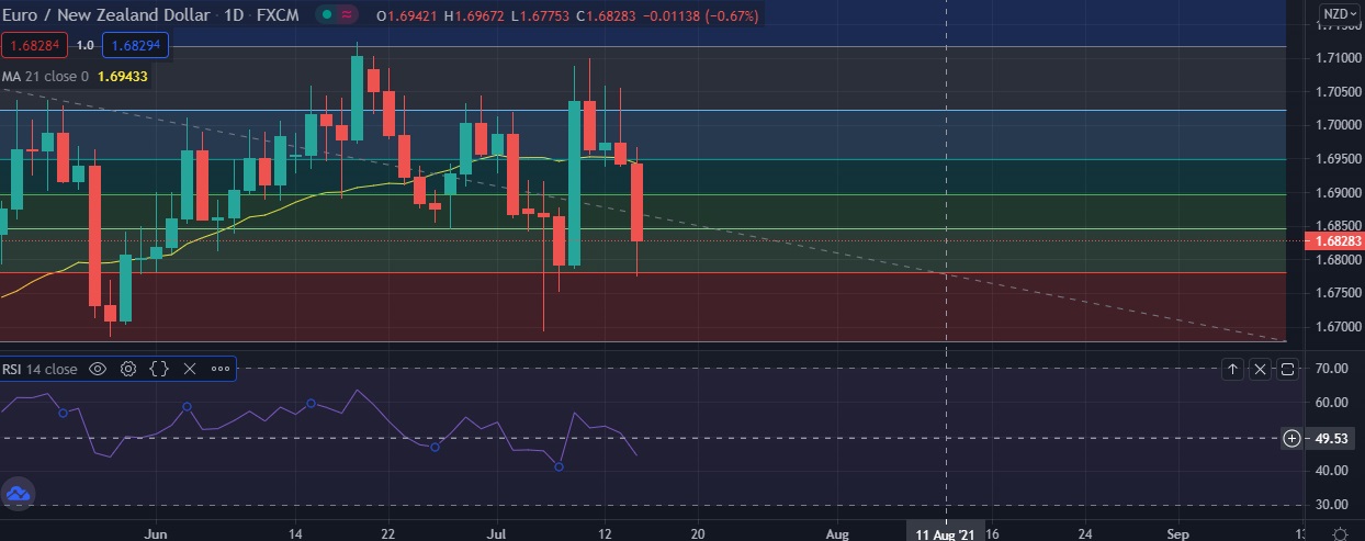 • EUR/NZD declined on Wednesday as kiwi dollar rose across the board after RBNZ struck a surprisingly hawkish note by halting its bond buying stimulus programme.