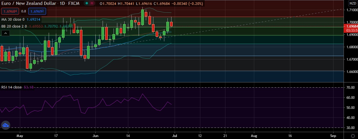 • EUR/NZD hits resistance at 1.7044, before retreating slightly to trade at 1.696 by 17:23 GMT.