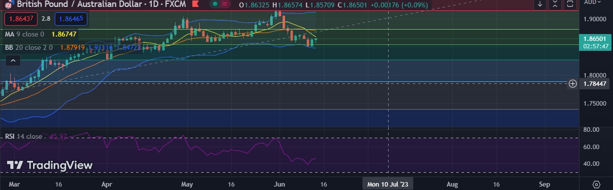 • Strong support is seen at 1.8529 (50%fib ), and break below could take the pair towards 1.8479 (Lower BB).