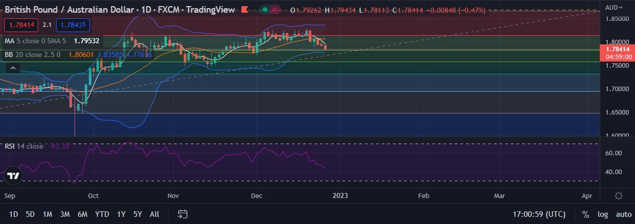 • Strong support is seen at 1.7826 (38.2%fib) and break below could take the pair towards 1.7754 (Lower BB).