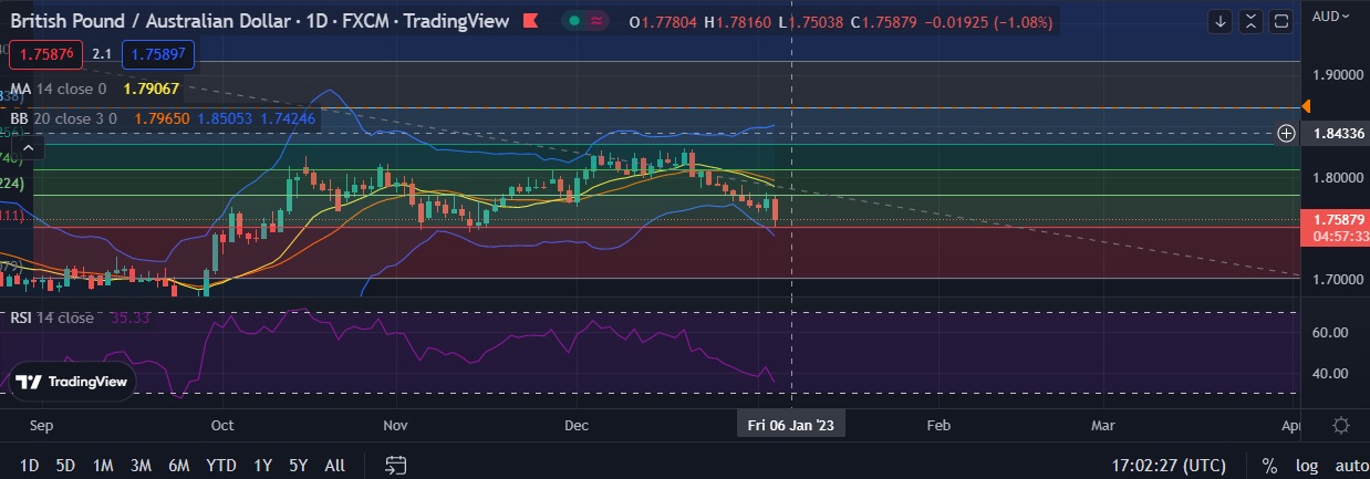 • Strong support is seen at 1.7516 (23.6% fib)and break below could take the pair towards 1.7433 (Lower BB).