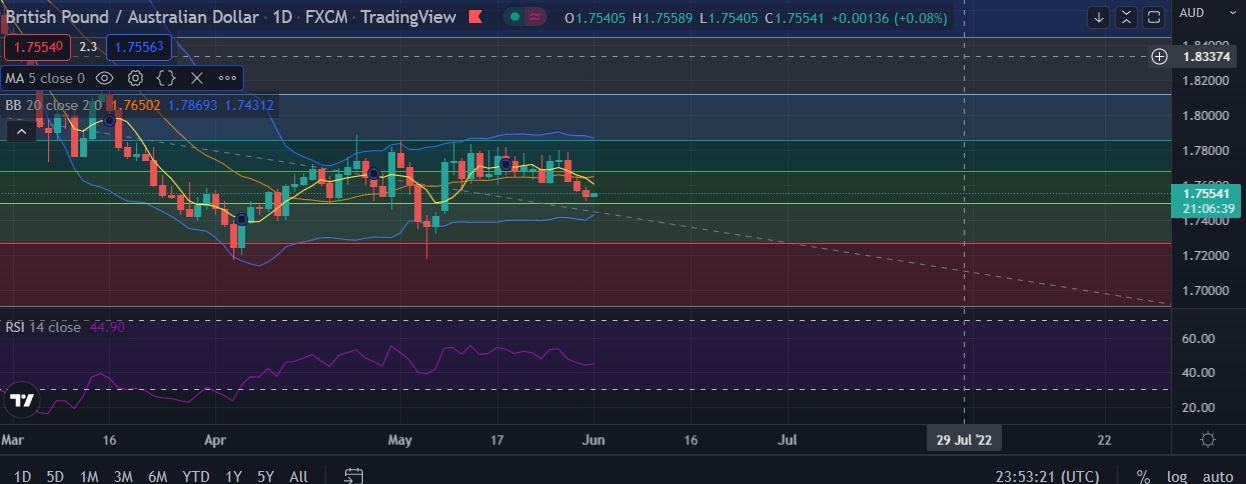 • Strong support is seen at 1.7502 (38.2%fib ), and break below could take the pair towards 1.7433(Lower BB).