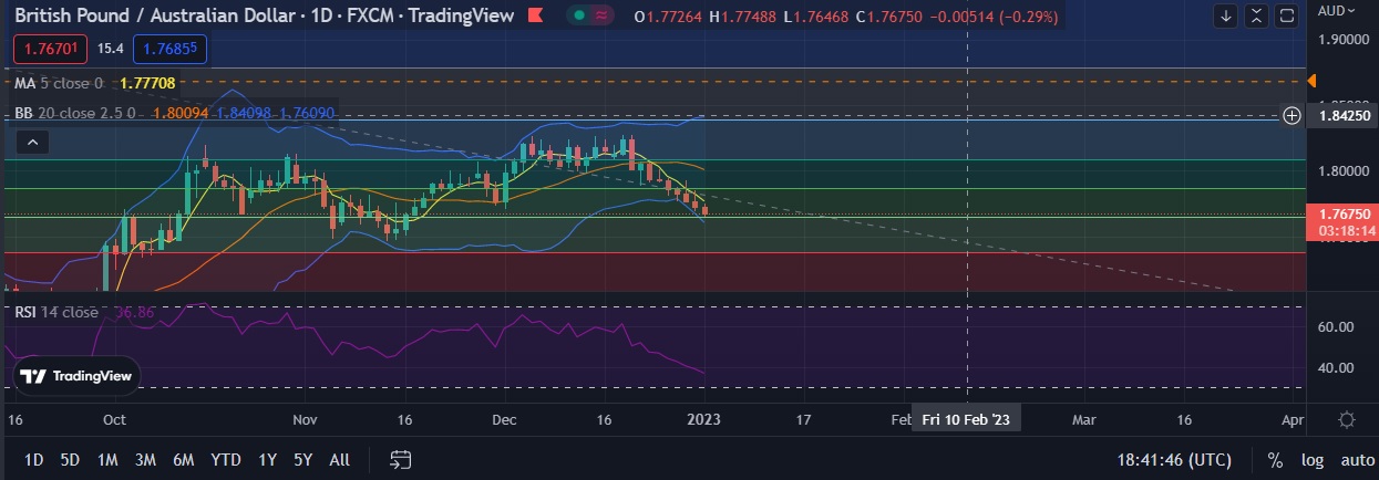 • Strong support is seen at 1.7656 (38.2% fib)and break below could take the pair towards 1.7609 (Lower BB).