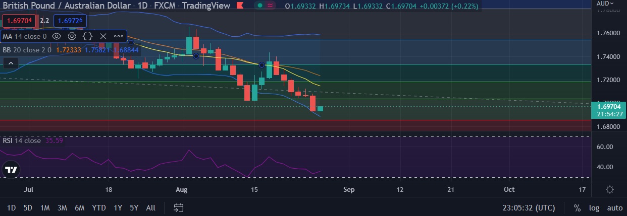 • Support is seen at 1.6934 (Lower BB) and break below could take the pair towards 1.6849 (23.6%fib).
