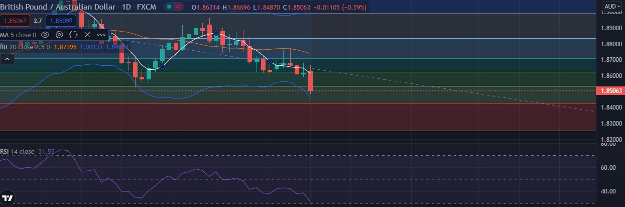 • Immediate support is seen at 1.8463 (Lower BB) and break below could take the pair towards 1.8428 (23.6 % fib)