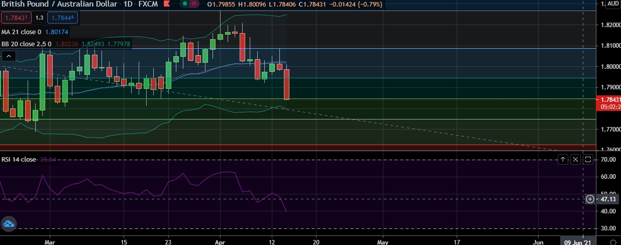 • Strong support is seen at 1.7797 (Lower BB) and break below could take the pair towards 1.7746 (38.2%fib).