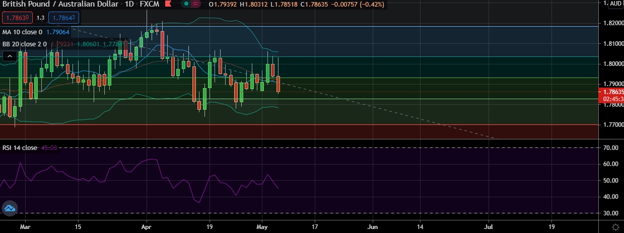 • At GMT 18:16, the pair was trading 0.45% lower at 1.7858. The cross pairs bearish bias is set to strengthen, likely to drop towards 1.7780