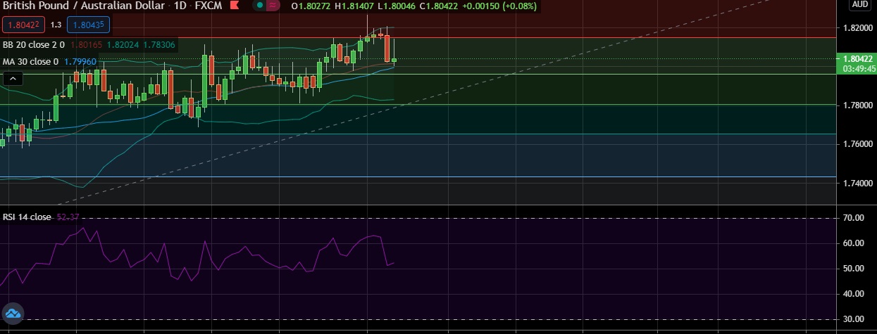 • Strong support is seen at 1.7990 (30DMA ) and break below could take the pair towards 1.7946 (38.2% fib).