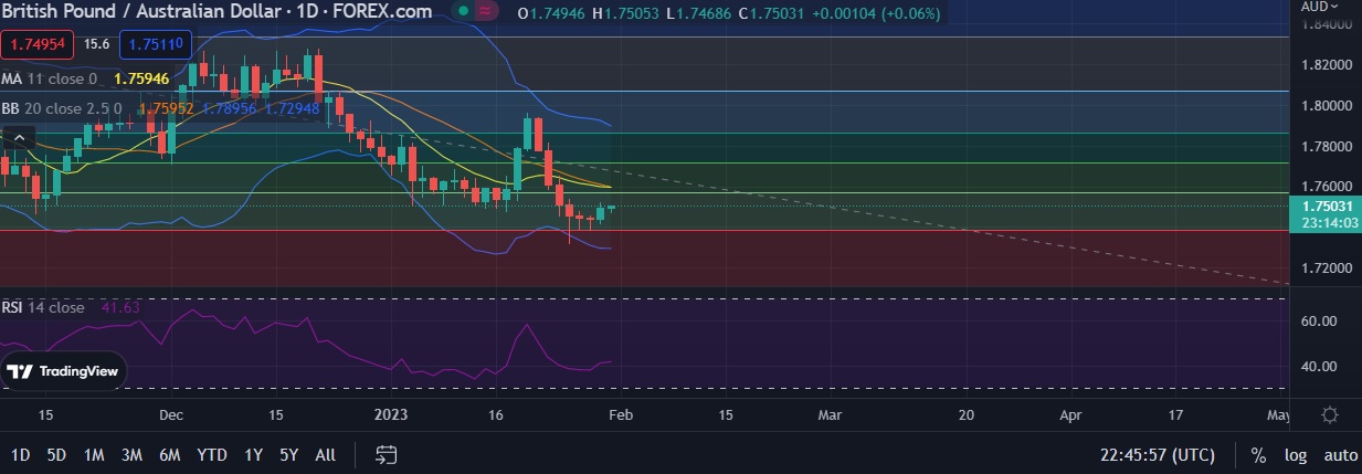 • Immediate support is seen at 1.7382 (23.6%fib) and break below could take the pair towards 1.7292(Lower BB).