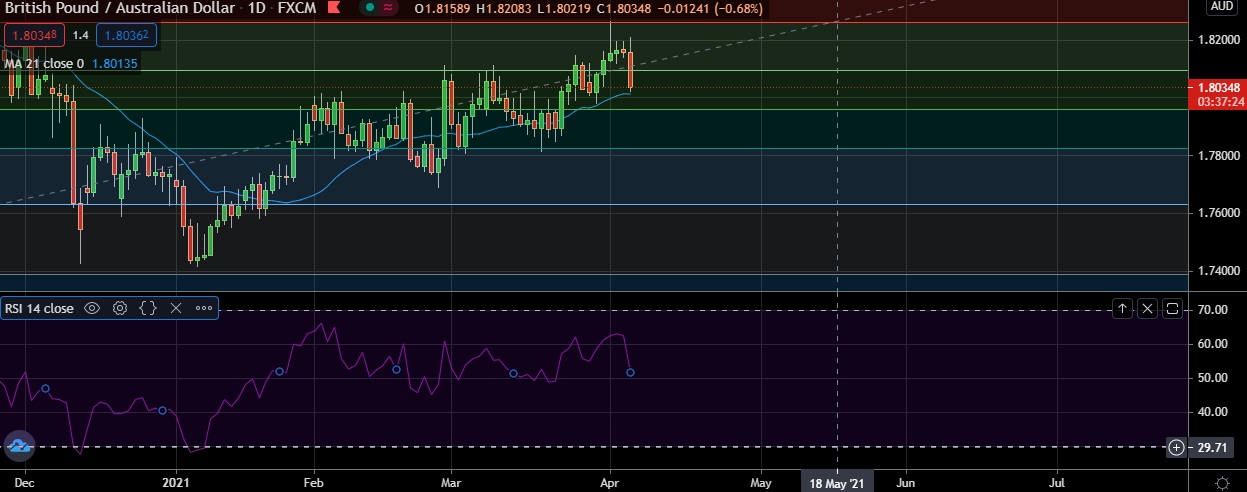 • Immediate support is seen at 1.8015(21DMA ), break below could take the pair towards 1.7963 (50%fib).