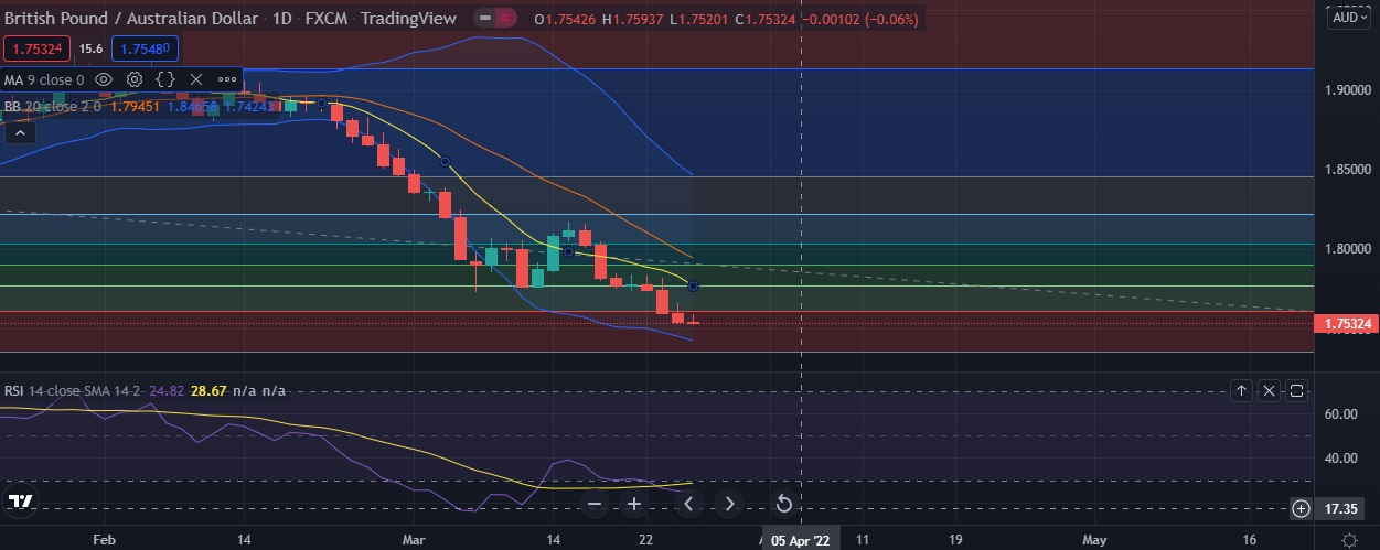 • Strong support is seen at 1.7521 (Daily low ), and break below could take the pair towards 1.7424(Lower BB).
