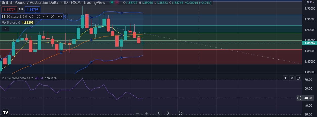 • Strong support is seen at 1.8815(23.6%fib) and break below could take the pair towards 1.87601 (Lower BB).