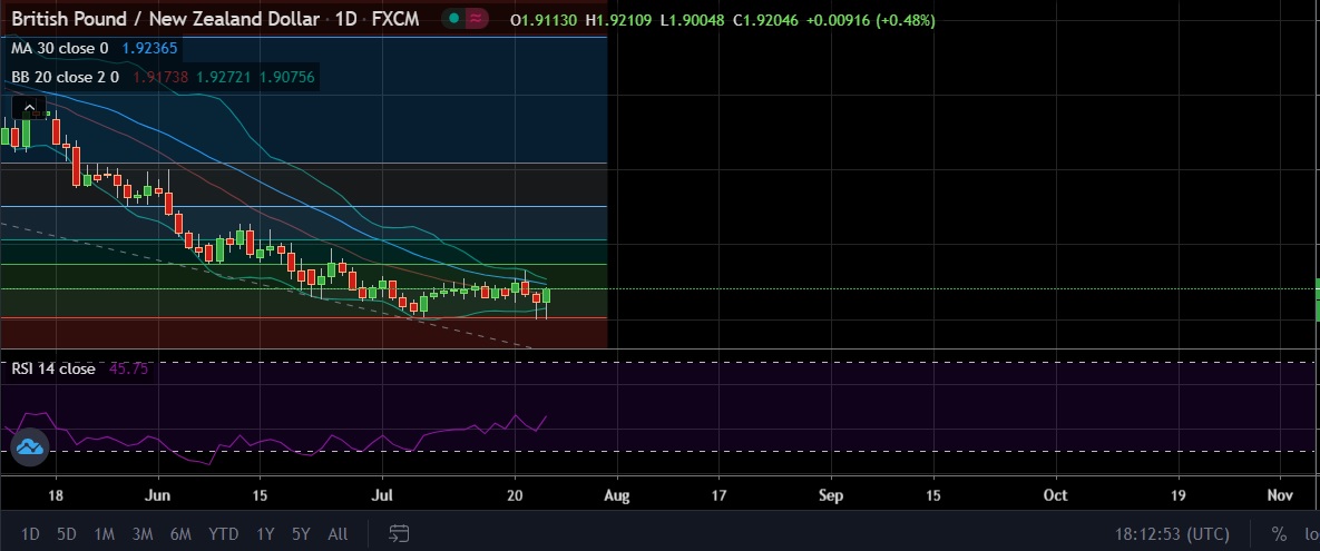 • On the downside, strong support is seen at 1.9077 (Lower BB) and break below could take the pair towards 1.9014 (23.6% fib).