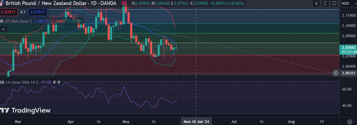 • Strong support is seen at 2.0713 (23.6%fib ) and break below could take the pair towards 2.0674 (Lower BB).