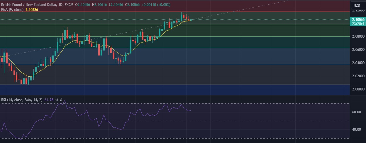 • Strong support is seen at 2.1037 (9EMA) and break below could take the pair towards 2.1000 (38.2% fib).